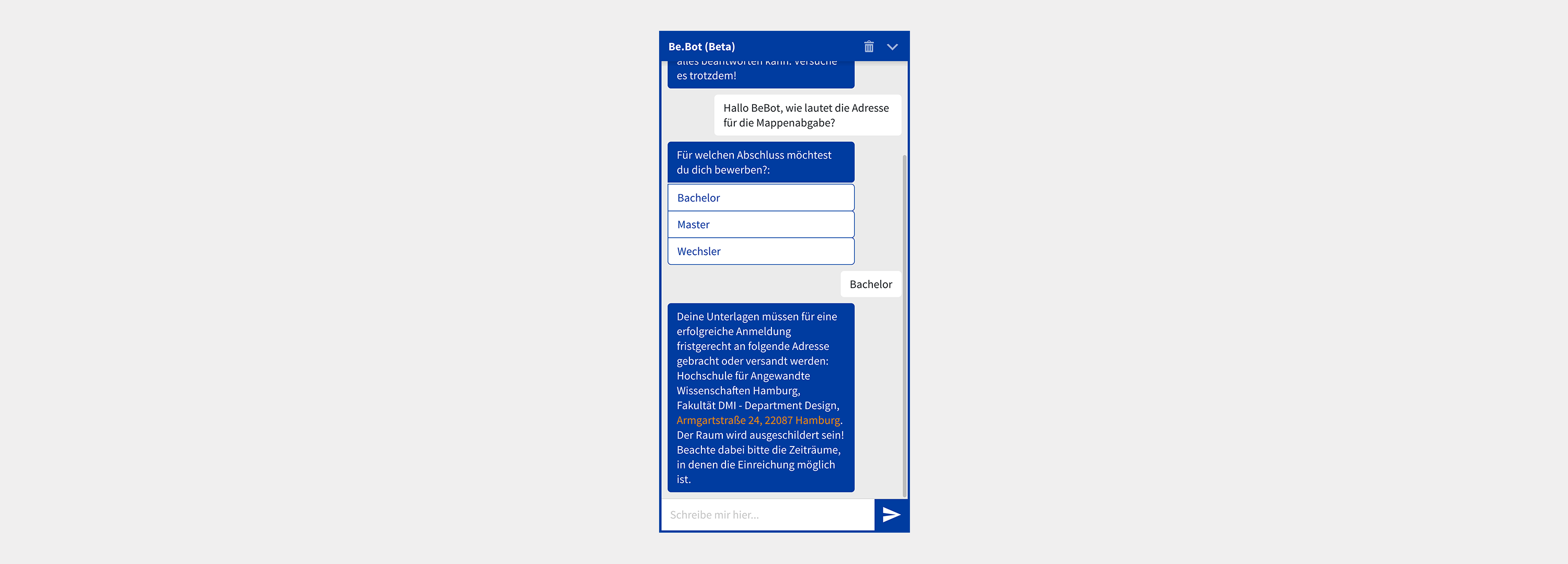 Ich hoffe, der BeBot wird auch noch lange nach meiner Zeit an der HAW zukünftigen Bewerbern zur Seite stehen!