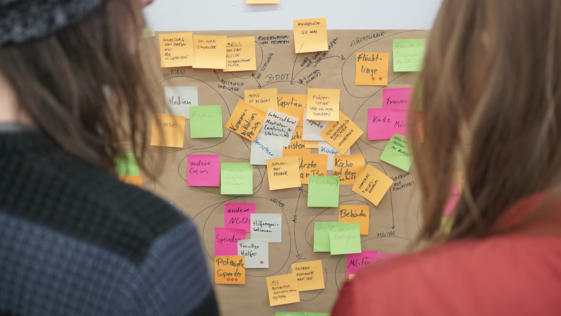 Im ersten Brainstorming kreisten unsere Ideen um drei Kernfelder: Erstens Fragen rund um Spendengelder für die Seenotrettung, zweitens die Frage, wie man Geflüchtete mit relevanten Informationen versorgen könnte sowie schließlich drittens Fragen rund um die Besatzung der Sea Watch und der internen Organisation. Zum letzten Punkt zählten so spannende Fragen wie: Wie kommunizieren die Seenotretter mit den Geflüchteten? Wie bekommt die Besatzung psychologische Betreuung, wenn dies nötig werden sollte? Wie werden Seenotretter in ihre Aufgaben eingeführt, und wie kann die Crew Wissenslücken neuer an Bord Mitarbeiter ausgleichen?