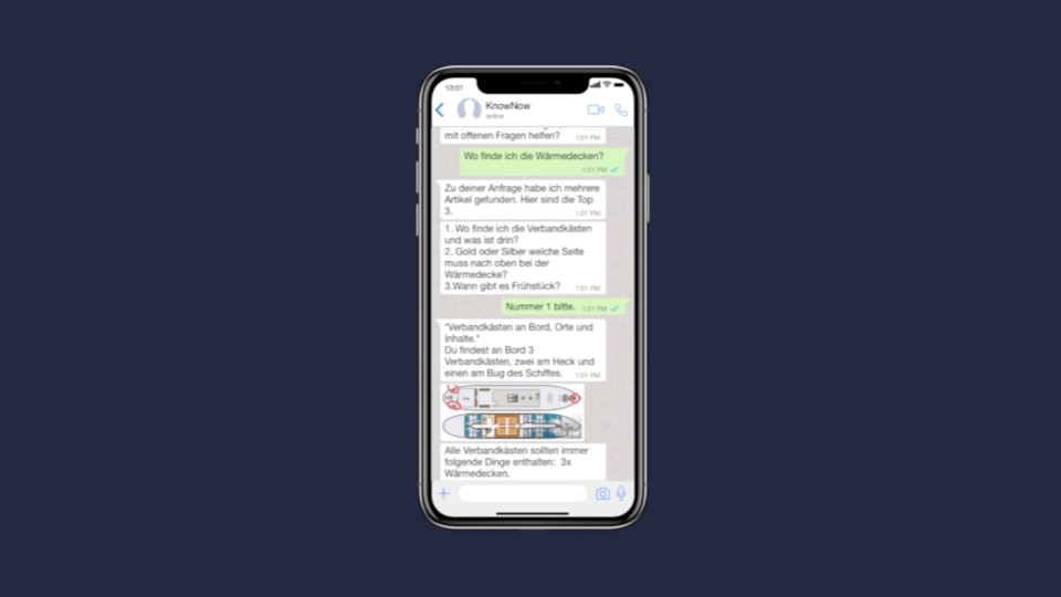 Besatzungswechsel auf der Sea Watch 3, das alte Team arbeitet die neue Crew ein. Es gibt Rundgänge, Checklisten und viel Input für die Neuen. Das Schiff legt ab, die erfahrenen Kollegen sind von Bord gegangen. Wie prüft man bei dieser Maschine nochmal den Ölstand? Wann waren nochmal die Frühstückszeiten? Für all diese Fragen gibt es KnowNow, den Chatbot, der alle wichtigen Infos für die Crew zum Abruf bereit hält und das zentrale Gehirn des Schiffes ist, wenn es um alle möglichen Fragen geht. Wie einem realen Chatpartner kann man dem Bot über WhatsApp eine Frage stellen, Antworten auf neue Fragen werden über die Community ergänzt.